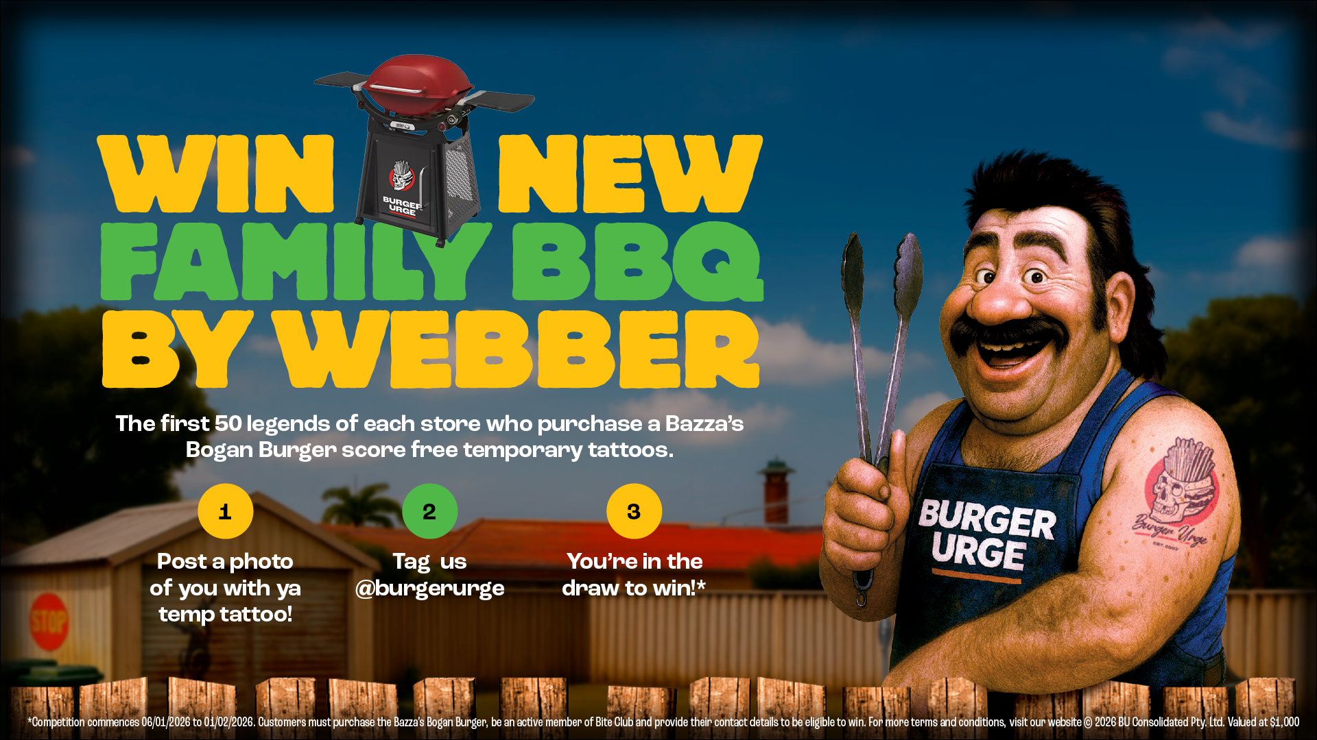 PLUS: The first fifty (50) customers who purchase Bazza's Bogan Burger will receive our limited temporary tattoos which is the first step to your chance in winning a brand new Weber Q. Slap the tatts on, post a pic on your socials and tag @burgerurge to enter the draw.