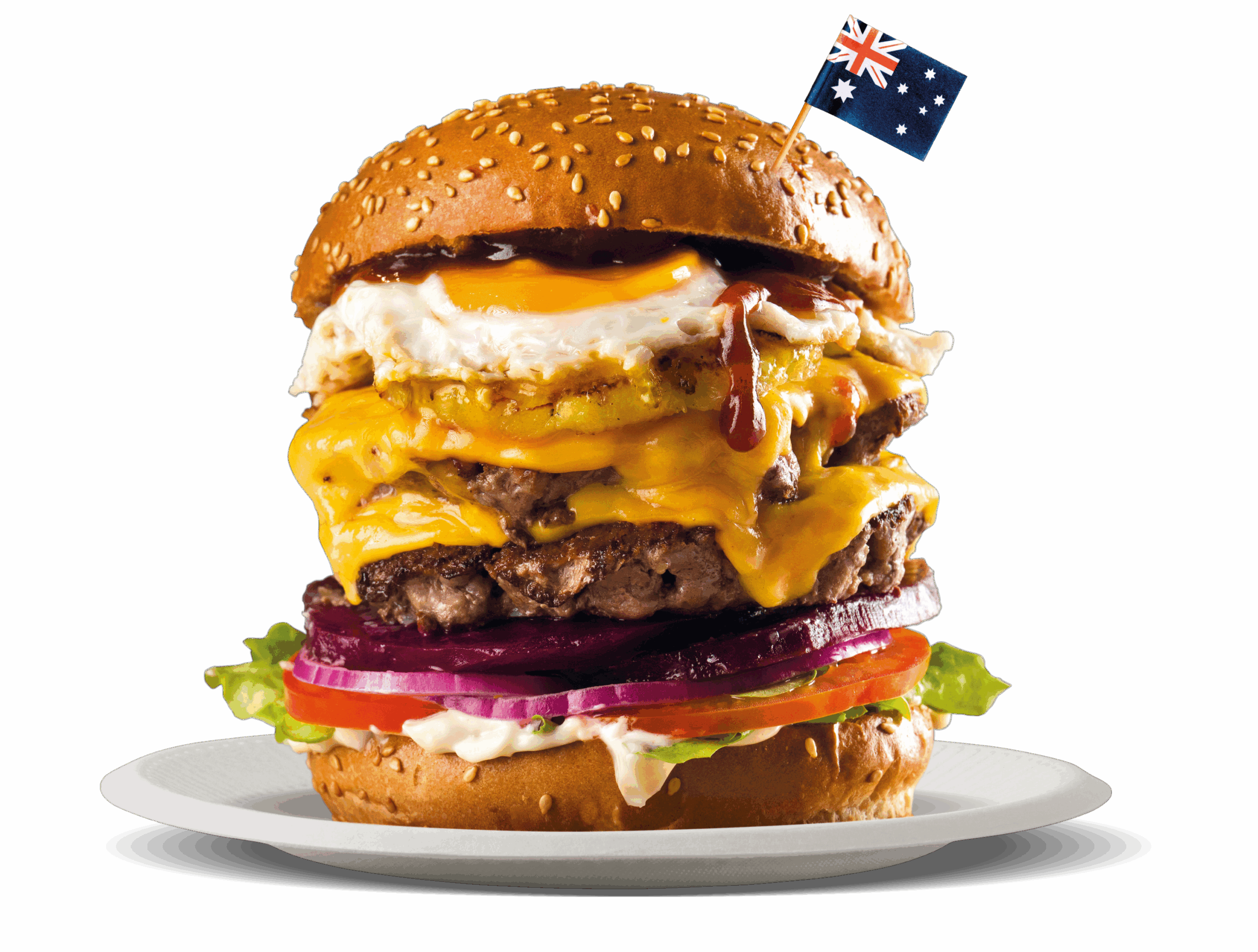 This thing's built big.: 2 x beefy patties, double cheese, fried egg, grilled pineapple, beetroot and more than a fair shake of the sauce bottle on a bed of crisp lettuce, fresh tomato and red onion. All the flavours Aussies know and love.